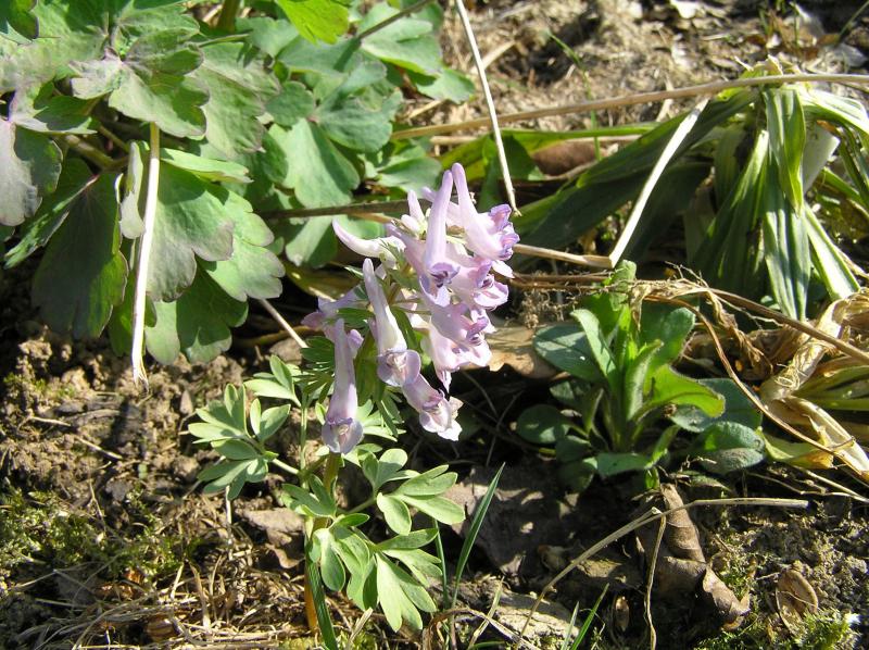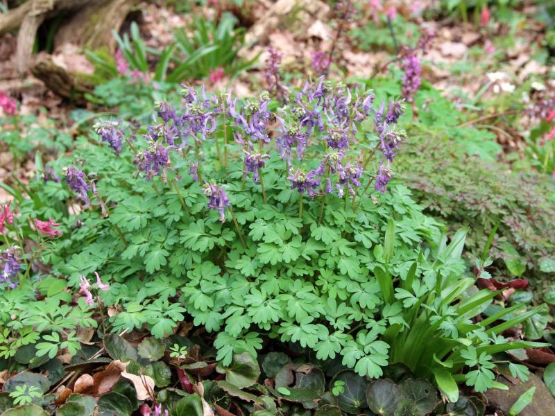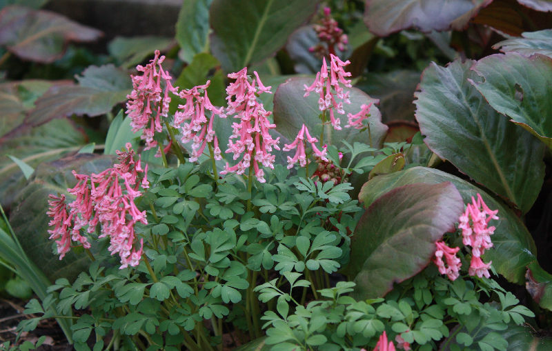 Quietschrosa vor Bronze - im Schatten der Nordweite wächst Corydalis solida etwas laxer.