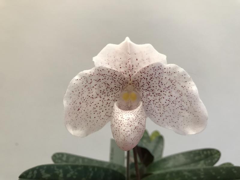 Dies ist eine Hybride, ich vermute Paphiopedilum Wellesleyanum.