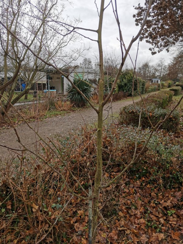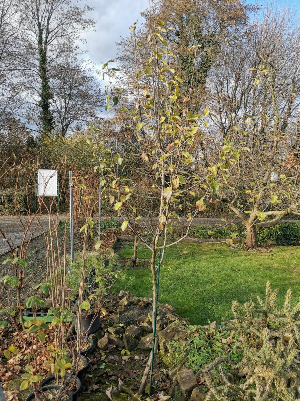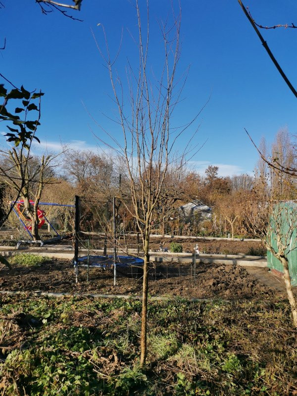 Hat sich auch gut entwickelt, bisschen Zwetschgenrost und daher recht früh das Laub verloren, aber gesunder Wuchs und schöne Astabgänge, nicht so steile Winkel mit Schlitzästen. Wird jetzt weiter aufgeastet, sie ist gerade mal 2m hoch aktuell.