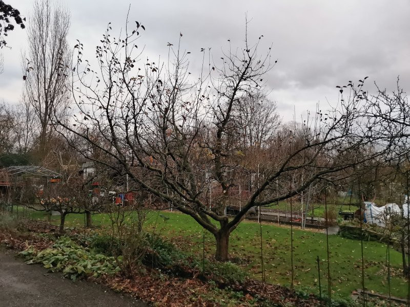 Holzreife, ein Jungbaum Gewürzluiken, so 4tes Jahr etwa und 3m, der hat noch Laub. Beim Rest der Ertragsfähigen Bäume ist es so gut wie weg. Das Laub von den Spindeln habe ich schon vor Wochen weggeräumt, damit das Schorfzeugs nächstes Jahr nicht gleich infiziert. Die sind dieses Jahr mal endlich nicht ewig durchgetrieben, sondern haben einen guten Abschluss der Endknospe. Beim Pinova gibts ein paar Mehltautriebe, ich hoffe ich erwische alle beim Winterschnitt. Da sollte ich nächstes Jahr ab Austrieb auch mal etwas mehr hinterher sein.