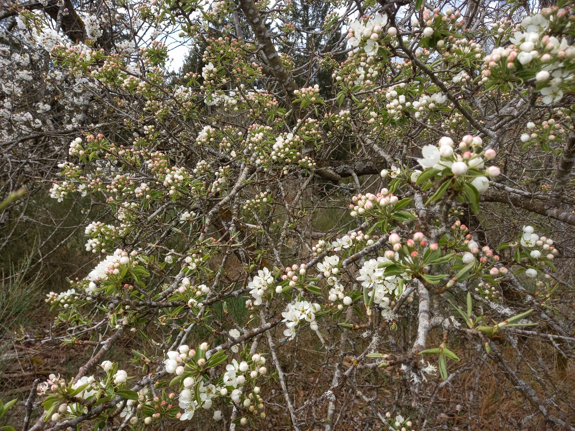 Bei mir blühen jetzt die Birnen. Das schöne ist, alle gleichzeitig. Belgische Blutbirne (AT), Clapps Liebling, Nashi und Aroma Spur. Blutbirne ist in ihrer ersten Vollblüte. Clapps hatte sie letztes Jahr, aber hat nichts angesetzt. Spätfrost. Dafür hat sie dieses Jahr kaum Blüten. Aroma Spur mit seinen 30 cm trägt reichlich. Sie war mal größer, ich musste sie wegen Krebses herunterschneiden.