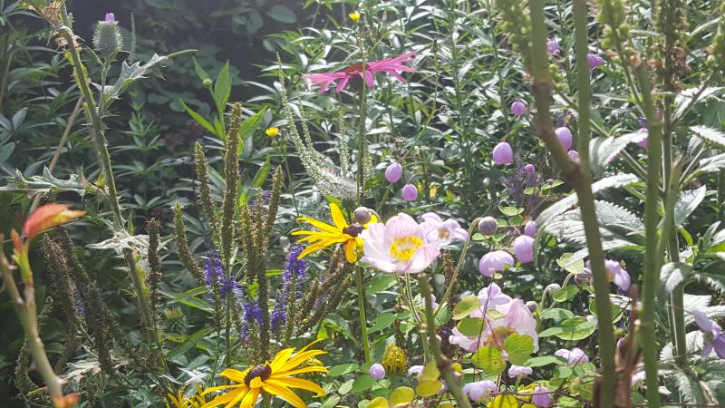 Blütenwirrwarr, ua Thalictrum " Splendid", Rudbeckia " Goldsturm ", Scheinsonnenhut, Veronicastrum, Anemome