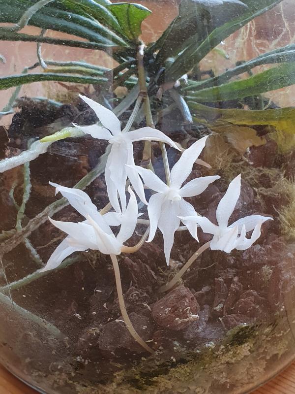 Zwischenzeitlich war die Aerangis kirkii im Flaschengarten verblüht, jetzt blüht sie aber schon wieder.
