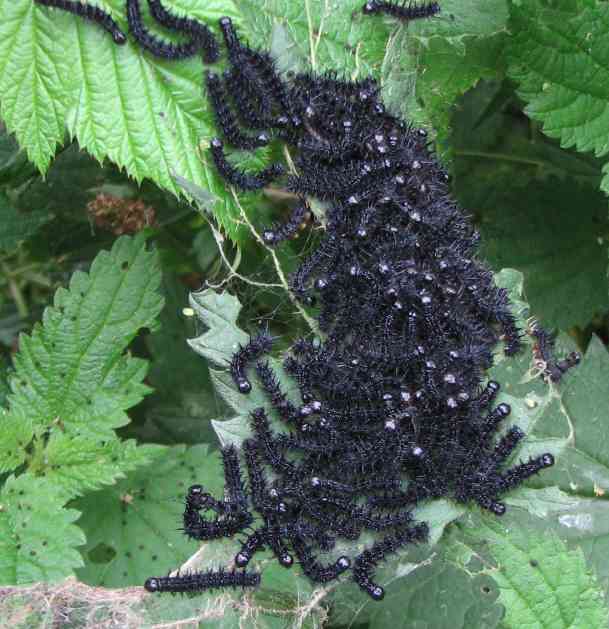 Tagpfauenauge Raupen Inachis ioDie wollte der Onkel meiner Freundin heute nachmittag verbrennen. Nur gut, daß ich rechtzeitig zur Stelle war und ihn daran hindern konnte. Er hat nur gesagt: "Nimm das Sauzeug weg, oder ich verbrenne es." Sie sitzen jetzt an meinen Brennesseln.