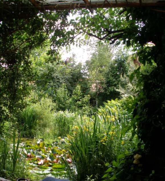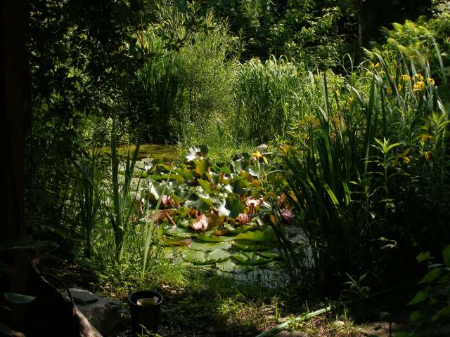 lehn ich mich gemütlich zurück auf der mit polstern ausstaffierten bank, und der blick fällt auf den teich, mit seerosen, gelben sumpfiris usw.