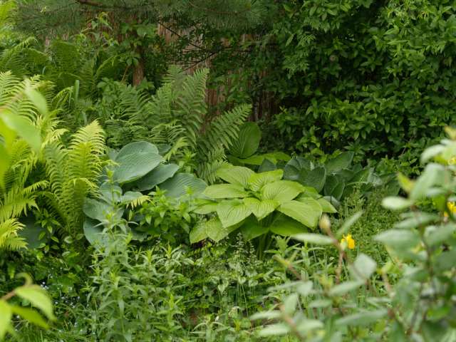 direkt beim durchgehen ist dort eine dschungelatmosphäre, der blick in den restlichen garten durch büsche verschleiert, die funkien üppig, die blüten zart.richtung haus gegangen und nochmals umgedreht: