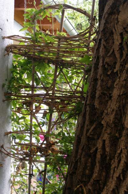 wieder am sitzplatz fallt mir eine ingeniöse konstruktion auf, um einen spalt zwischen baum mit hausmauer zu schliessen. wäre der offen, tät der sitzplatz nimmer ganz so geschützt sein