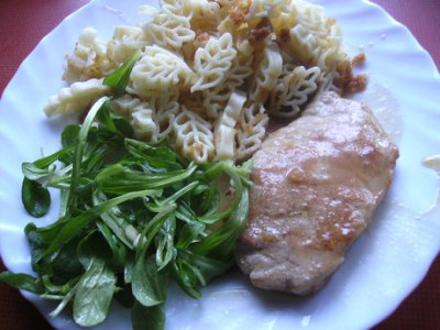 Ich habe heute gekocht: Schweinerückensteak, Nudeln mit "Kracherlin" und Ackersalat mit Walnußöl und Rockenbolle.