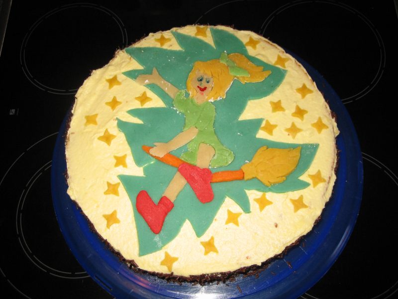 Oh,Luna GUTE BESSERUNG!Gestern waren wir beim Geburtstag eingeladen, ich sollte eine Torte mitbringen und das Geburtstagskind wünschte sich eine Bibbi Blocksberg drauf. Oh je!!Abends gabs dann dort Hähnchenschlegel mit verschiedenen Salaten.Achja beim Design der Torte hat mir Aella geholfen!