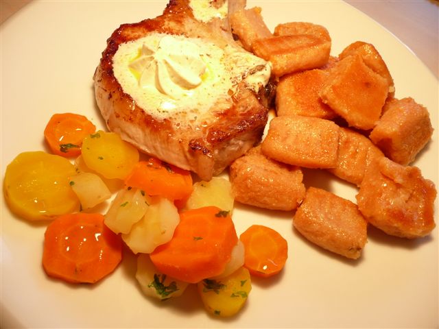 .Heute gab es Schweinerollbraten, gefüllt mit Schinken und Käse (dieser ist aber komplett ausgelaufen). Dazu Serviettenknödel und Kopfsalat.Anschließend rote Grütze (da bringe ich meinen Kirschpflaumensaft und die schwarzen Johannisbeeren unter, was sonst niemand will, dann kommen noch Himbeeren dazu).