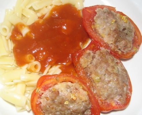 gebackene gefuellte tomatenhaelften (sorte: vera pepper) mit nudeln und sosse auf ketchup-basis: