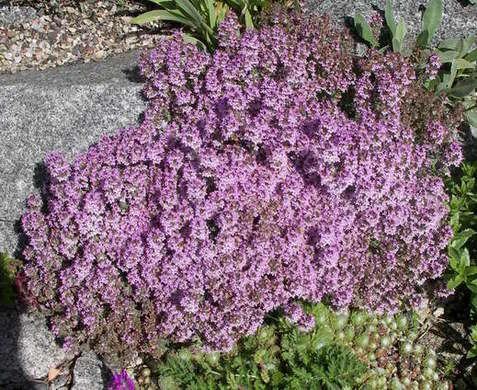 Wunderschön. die Campanula chamissonis im Gestein, fars.Ein reichblühender Thymian Thymus 'Peter Davis'