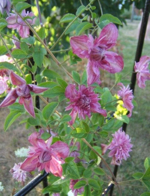 Ihr gegenüber am Rosenbogen Clematis viticella Maria Cornelia.