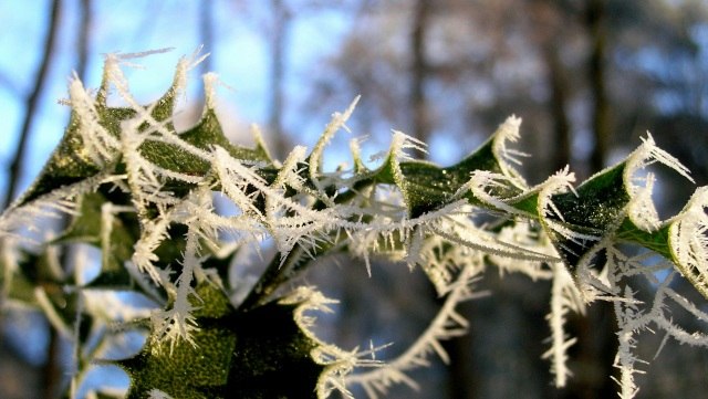 Das Foto soll nur meine Frage illustrieren:Warum ist der Fichtenzweig berauhreift, der Efeu aber nicht ?(beide Vollschatten)Liegts an der Oberflächenstruktur?