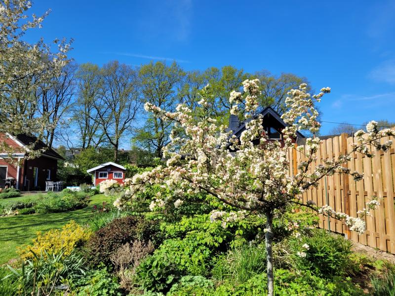 Mein Zierapfelbaum blüht in diesem Jahr erstmals sehr auffällig. Die qietschrosa Farbe leuchtet weit hin. Und er duftet auch. :D
