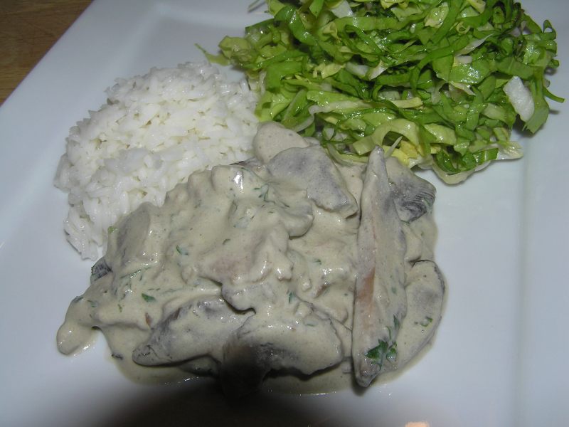 somit gabs geschnetzeltes mit putenstreifen und pilzen in frischkäse-weißweinsoße. dazu reis und endiviensalat.