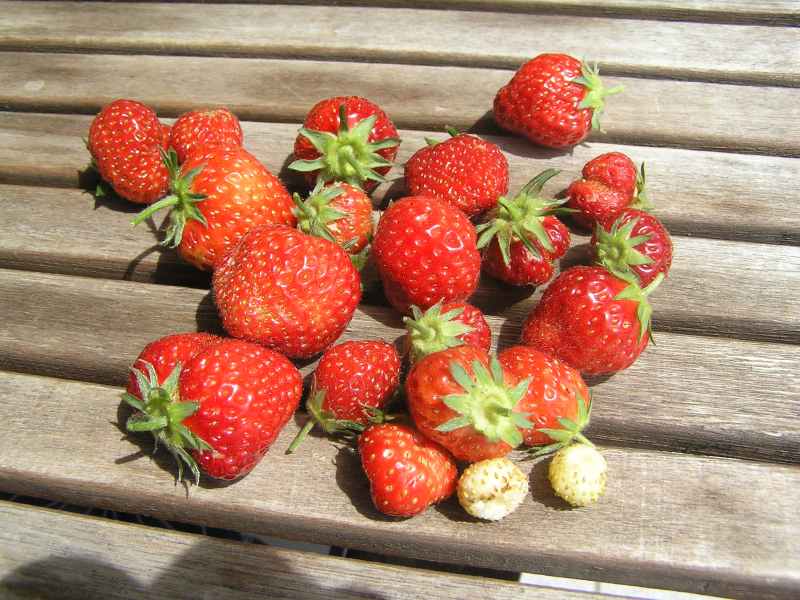 .Die Erdbeeren draussen fruchten wie immer wieder nur für die Mäuse, ein paar hab ich in einem großen Kübel, in den die Rötelmäuse jetzt, wo ich ihn von der Wand abgerückt hab, nicht mehr reinkommen, vorher haben sie auch dort alle Blätter abgefressen, letztes Jahr auch alle Früchte.