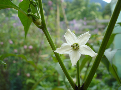 Blüten vom Baumchili Rojo haben gelbe Punkte.