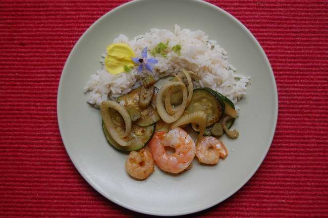 und einen teller mit viererlei grillsspiesschen (schwein, krokodil, springbock und garnelen) plus gemuese und reis