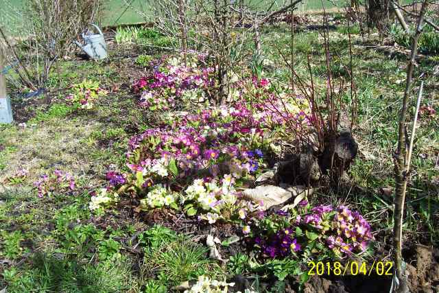 Die Primula vulgaris subsp. sibthorpii sind bei mir immer am am Wurzelhals verkahlt, ich habe nur noch einen kleinen Bestand von drei Pflänzchen unterm Säulenapfel Pomfital. Das paßt auch das Magenta gut hin.