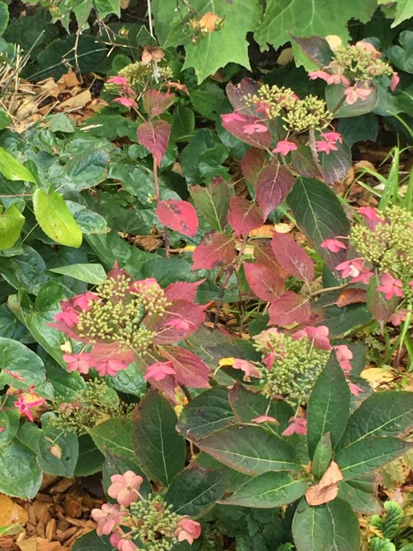 Sehr reizvoll, eure schlecht geschminkten (erinnert mich immer irgendwie an verrutschtes Rouge oder hektische Flecken). Ich mag das und habe mir damals Hydrangea serrata "rosalba" geholt, die ein ähnliches Bild kann - von weiß über fleckig bis dunkelrot im Spätherbst. Leider kein aktuelles Bild.