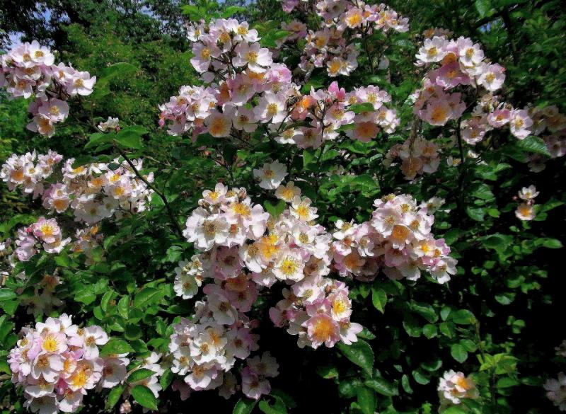 'Nevada'wird sehr ausladend ,wirkt am besten in Einzelstellung(kann ich hier nicht bieten)und die großen Blüten duften schön.Ich sehe sie hier fast als einmalblühend an,denn die Nachblüten sind viel,viel sparsamer als der erste Blütenrausch und mit langen Pausen.