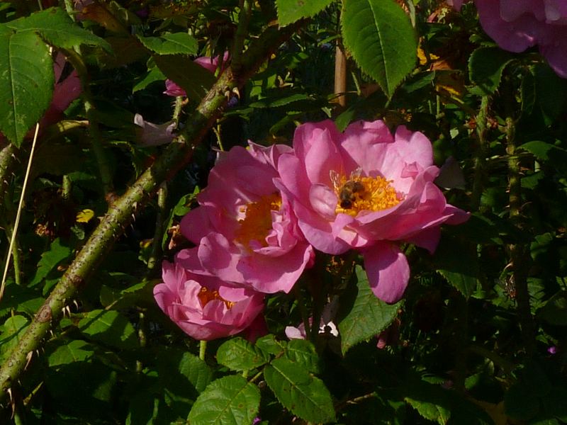 Und hier noch R. Moyesii Strauchrose 'Nevada'.In der summt und brummt es auch immer.Sie ist wohl neben der Schwester'Marguerite Hilling',die ein Sport sein soll (vielleicht war es ja auch eher umgekehrt),eine der bekanntesten Rosen vom spanischen Züchter Pedro Dot.Überhaupt haben die Spanier, im Vergleich,nur wenige Rosen gezüchtet.