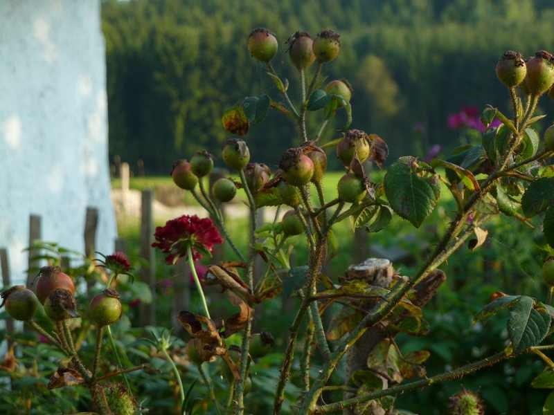 Die neben ihren hübschen Hagebutten auch im Herbst noch ein paar Blüten schenkt