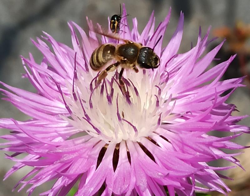 Halictus scabiosae fliegt hier auch, vor allem auf Centaurea dealbata. Einmaldrängten sich drei Weibchen in eine Blüte, aber ich war zu langsam... Deshalbnur eine Soloaufnahme.
