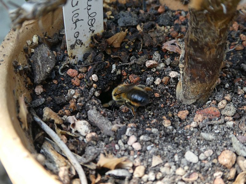 Die gepflasterten Flächen kann ich zur Zeit nicht fegen - in jeder Fuge graben Bienchen und Wespen. Leider finden einige aber auch mein Sukkulentensubstrat ganz, ganz toll. Ich überlege gerade, ob ich nicht ein paar größere Töpfe damit füllen, alles angießen (damit es schön verfestigt) und ihnen das anbieten sollte. Eine Blattschneiderbiene konnte ich beobachten, wie sie fleißig Blätter eintrug.