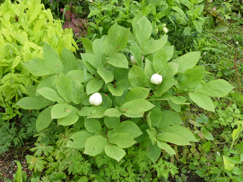 Ein zierlicher Zwerg ist Paeonia anomala, mein eigener Sämling noch einen Ticken zierlicher als die "Kola-Aulese" von Mr. Hepatica. Sogar im Vergissmeinicht gehen sie fast schon unter.