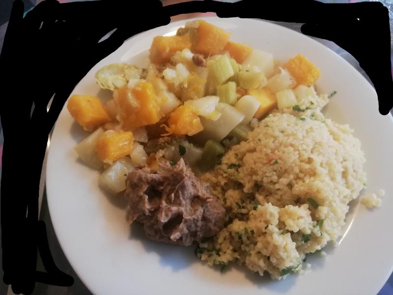 Ich hatte heute allerlei zu verbrauchen ind habe improvisiert. Es gab Bulgar mit etwas Rosenharrissa.gewürzt, dazu Pfannengemüse: Zwiebeln, Mairübchen, Kürbis (Melonette) und Rhabarber und eine Paste aus Bohnen und Avocado.