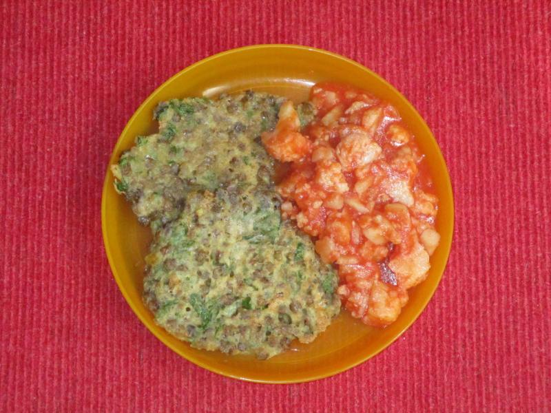 Knoblauchsrauken-Linsen-Bratlinge mit Blumenkohl in Tomatensoße