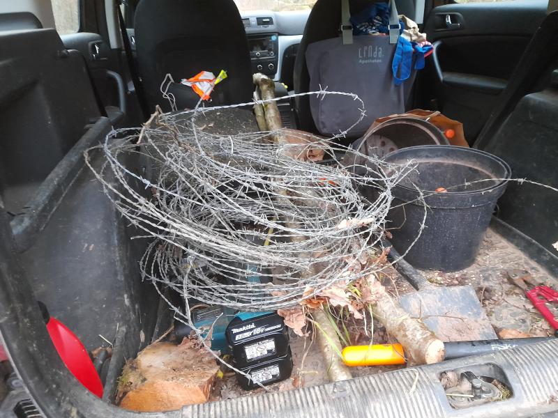 Tja. Da stand ich dann mit offenem Mund und dachte ich hätte ein Dejavue! 75 m vor dieser Stelle lag letztes Jahr eine Eiche. Und nun... ganz frisch.... wieder eine. Hinter den kapitalen Haseln für die ich dann allen Ernstes noch die Stiehl wieder auspacken muss. Da brauche ich mit der Makita nicht dran rumfeilen. Tja, und so habe ich nach Absprache mit dem Förster - hatte doch tatsächlich kurz Empfang - Stacheldraht geknipst, damit der kapitale Baum nach oben rausgezogen werden kann.