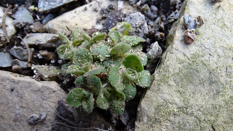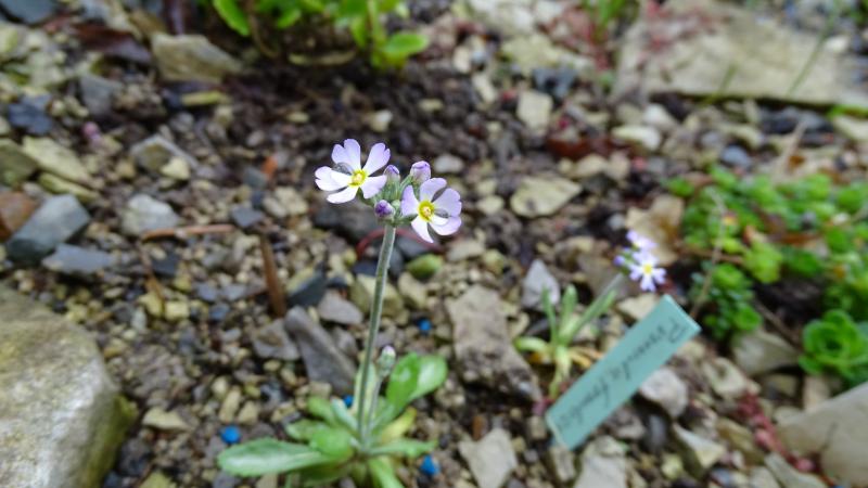 Allioni-Primel (Primula allionii) leider etwas mit Transportmaterial bestäubt. Es ist eine sehr zierliche Pflanze und mal sehen ob sie in diesem Jahr noch blüht.