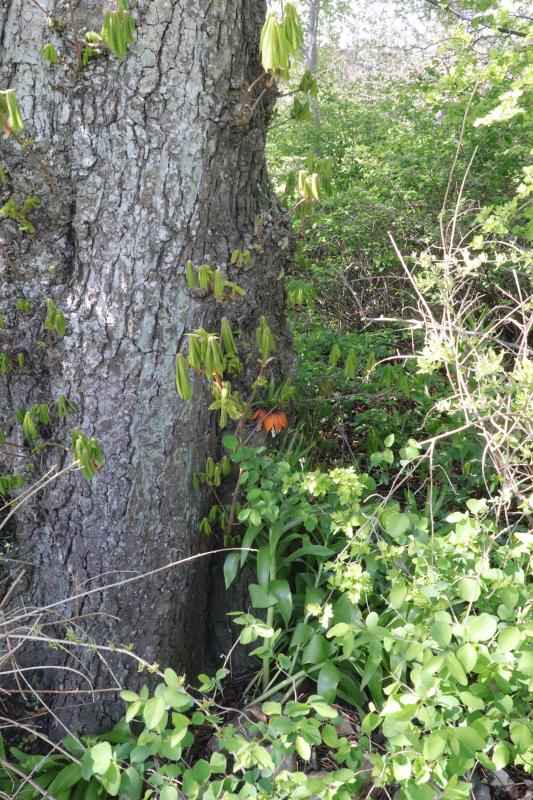 Kaiserkronen in einem Gehölzstreifen am Stamm einer Rosskastanie.