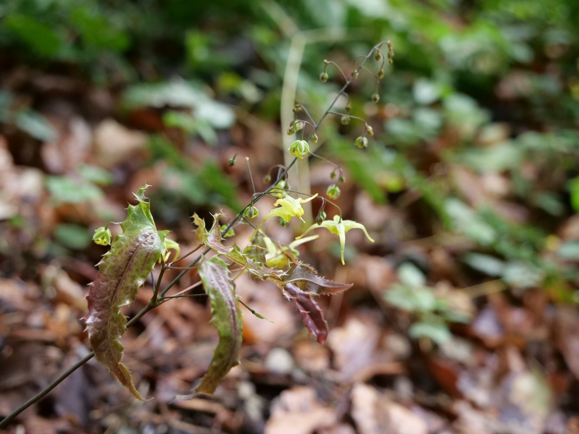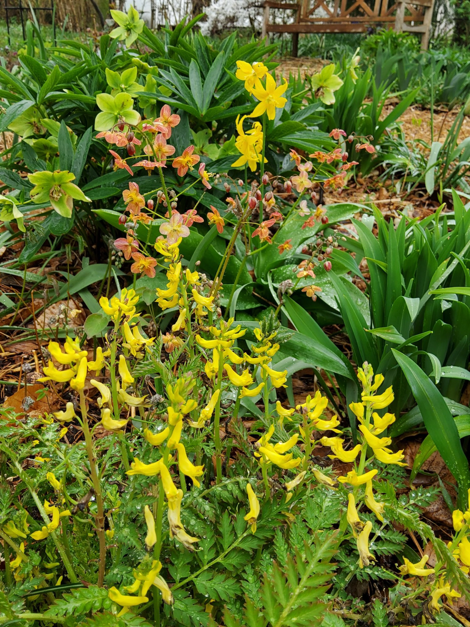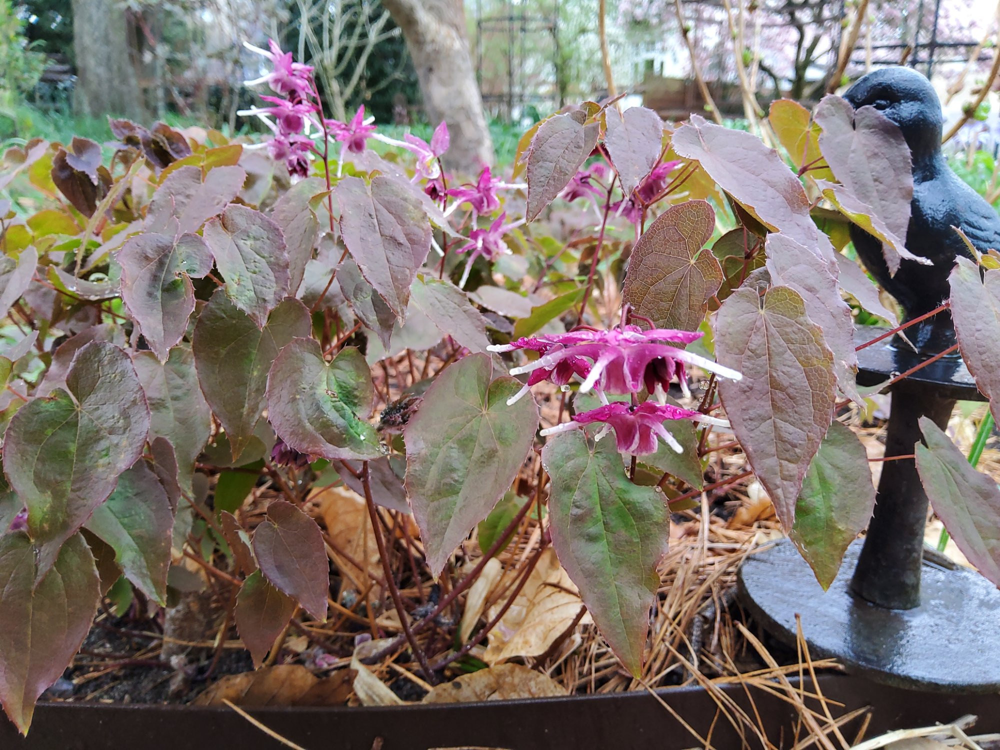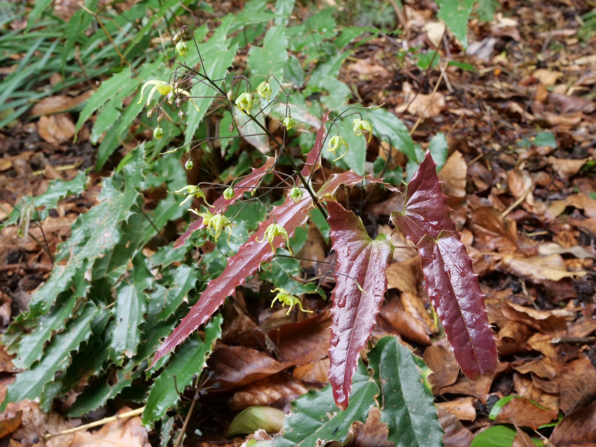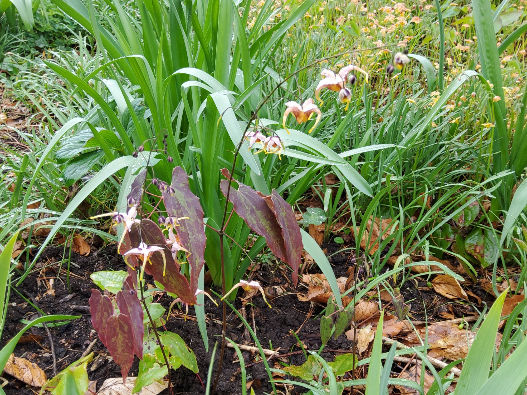 Hier zeigt sich gerade Epimedium Mandarin Star. Die wächst eher locker mit einzelnen, langen Blütenrispen: