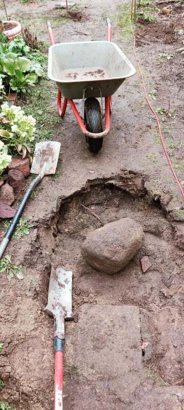 Der Untergrund ist äußerst schwierig, GG hat beim Setzen der vielen nötigen Schnurnägel bei nur etwa zehn Zentimeter hindernisfreiem Boden die Krise gekriegt. Derweil habe ich das erste Stück Weg ausgeschachtet und mich durch die Hinterlassenschaften von Generationen gearbeitet. Einige Karren Feldsteine sind es unter anderem geworden. Dabei sieht es noch gar nicht so wild aus. Jedenfalls ist es recht mühselig.