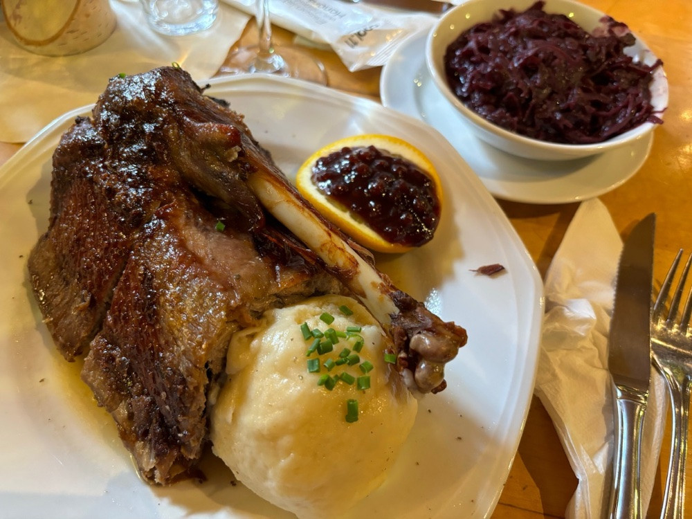 Beim Heurigen in Sooß: Gansl mit Rotkraut und Erdäpfelknödel