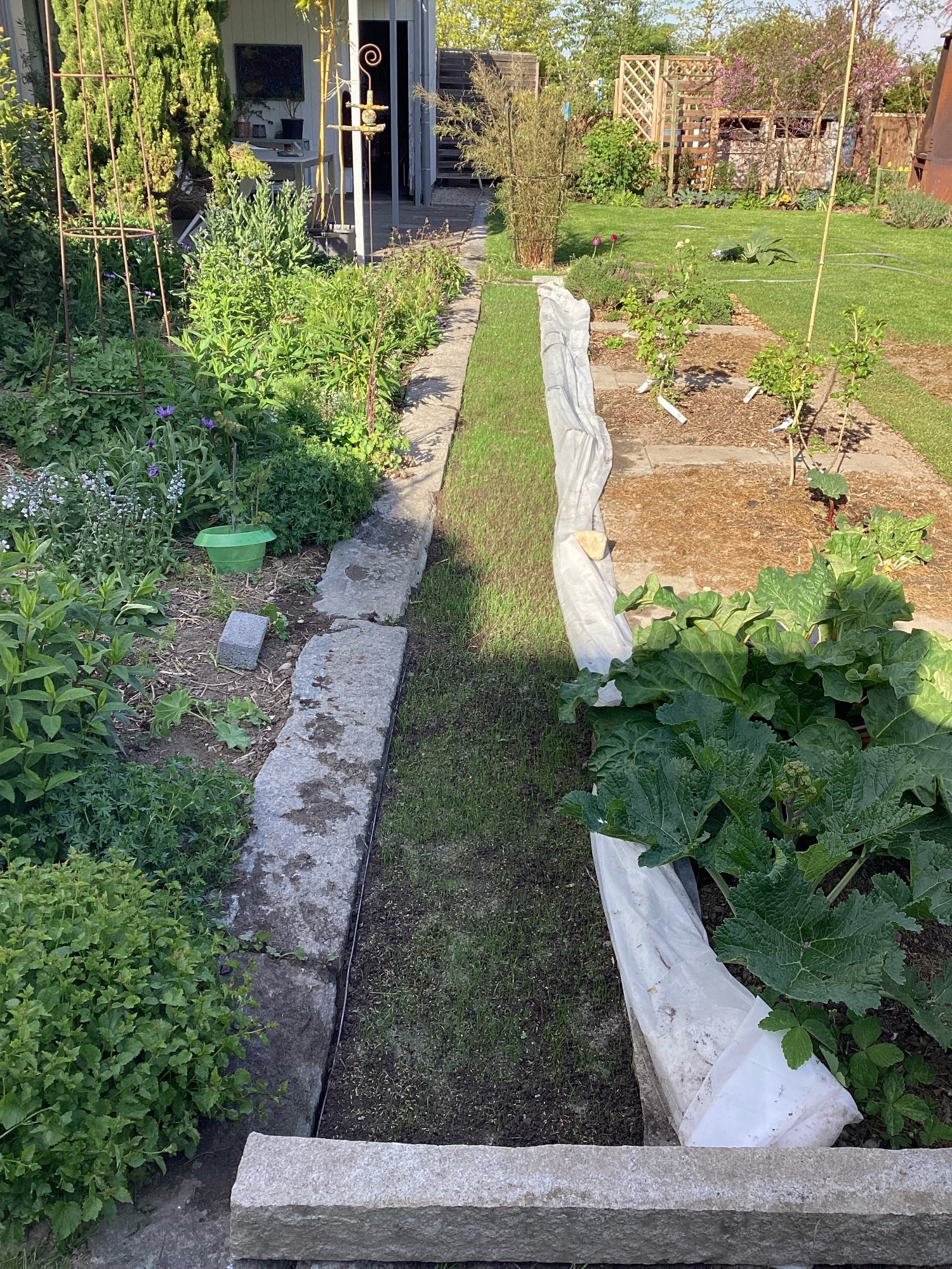 Ich habe gestern nur gegossen, zu mehr war keine Zeit. Heute möchte ich weiter an meinem Beet arbeiten, d.h. das Gras abtragen, damit andere Stauden dorthin umziehen können. Außerdem werde ich auf dem Hof Gras entfernen und meinen Beinwell und die Königskerzen auspflanzen (später Nachmittag ist es dort schattig).
