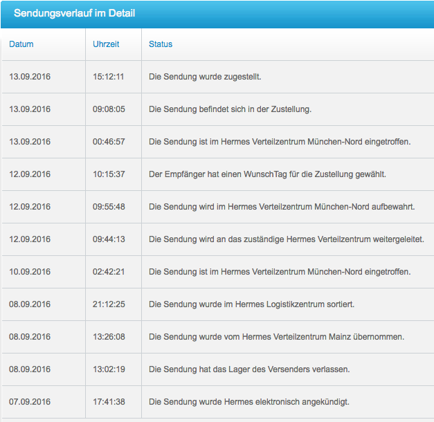 Aber die Logistik von Hermes scheint nicht die beste zu sein - siehe den Log des Sendungsverlaufs: