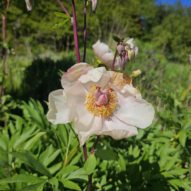 die Päonie bisher unbeschadet. Die Honigbienen lieben sie. Immer noch keine Rosenkäfer