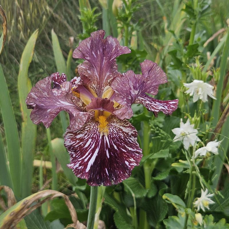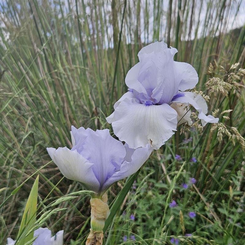 im Hintergrund die Wiese, noch ist kein Heu gemacht. Um die Irispflanzungen wird gemäht. Um die Iris wird gejätet. Zwischen den Iris dann nach der Blüte.