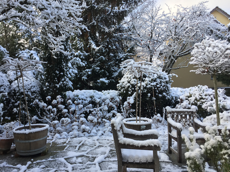 Da hat euch heute auch die Schneefront erreicht. Die Gräser und die hohen Fetthennen (mit den Schneemützchen)
