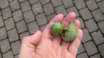 Wenige Früchte, dafür sehr gross. Der vorhergesagte Orkan übermorgen hätte sie sowieso runtergerissen. Sie blühen ja sehr folgernd, 90% der Blüten sind am 21.4. erfroren, mittlerweile leider üblich. Südlich der Donau hätts geklappt. Aus ein paar wenigen Nachzüglerblüten ist dann was geworden, aber eben erst spät, sehr spät, das fehlt wieder mal hintenraus.
