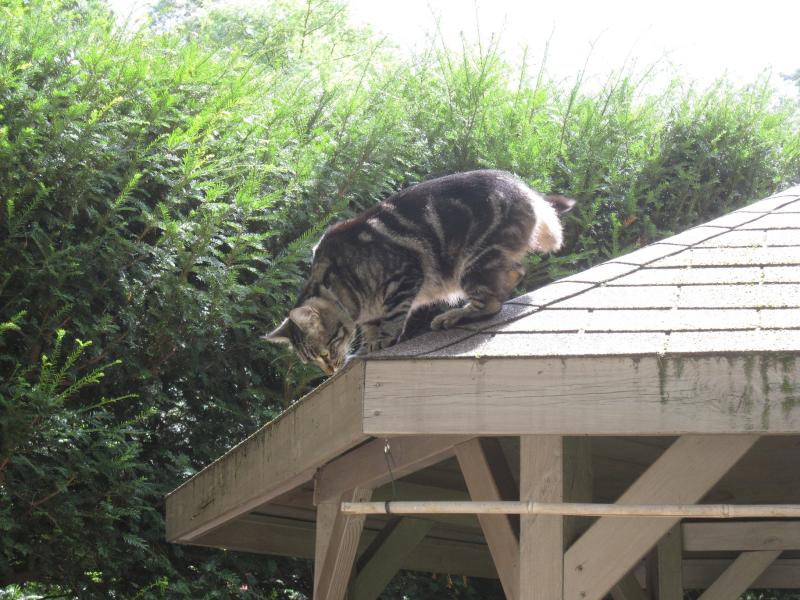 , hatte Coquine ihre fünf Minuten: Mit Vollstoff durch den Garten und der Restschwung reichte noch aus, um auf den Baumstamm hochzuschießen und von da auf das Pavilliondach zu springen.