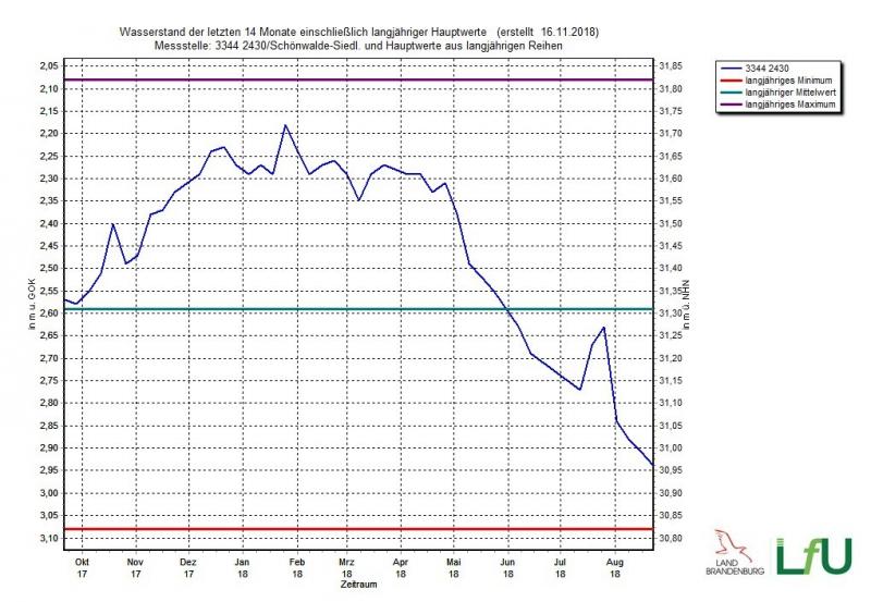 Das ist im obersten, nach den Detaildaten weitgehend unbedeckten Grundwasserleiter. Bei einem Flurabstand von weniger als 3 m im Sand erreicht der Niederschlag die Grundwasseroberfläche in Windeseile. Verwunderlich finde ich, dass nicht einmal im vergangenen Sommer das langjährige Maximum erreicht wurde. Immerhin liegt die Messstelle nahe an den Gebieten mit 180 bis 200 mm Tagesniederschlag Ende Juni 2017. Die Wiesengebiete um Schönwalde standen auch über Monate unter Wasser.
