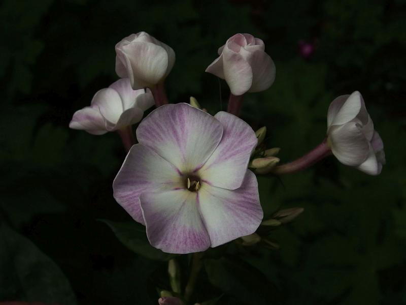 Erneut ein kugeliger Blütenstand, dazu der weiße Schlund, der wie ein kleines weißes Auge wirkt. Außerdem steht der Phlox auf dunklen, straffen Stielen. Morgens und abends schimmern die Blüten blau.