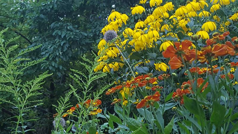 Die gelbrotorange Blütenwelt der Helenien dominiert hier so langsam die Szene, im Hintergrund Rudbeckien