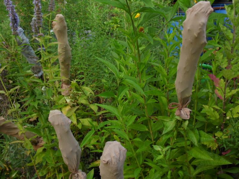 Ich habe lange überlegt, wie und mit was ich abbinden kann. Die einen Blütenstände sind riesig, prall mit Samenkapseln dicht an dicht. An anderen findet sie nur eine oder 2 Kapseln, z. B. bei 'Drakon'. Entschieden habe ich mich für Feinstrumpfsöckchen. Mal schaun, ob das gut geht und darunter nichts schimmelt.